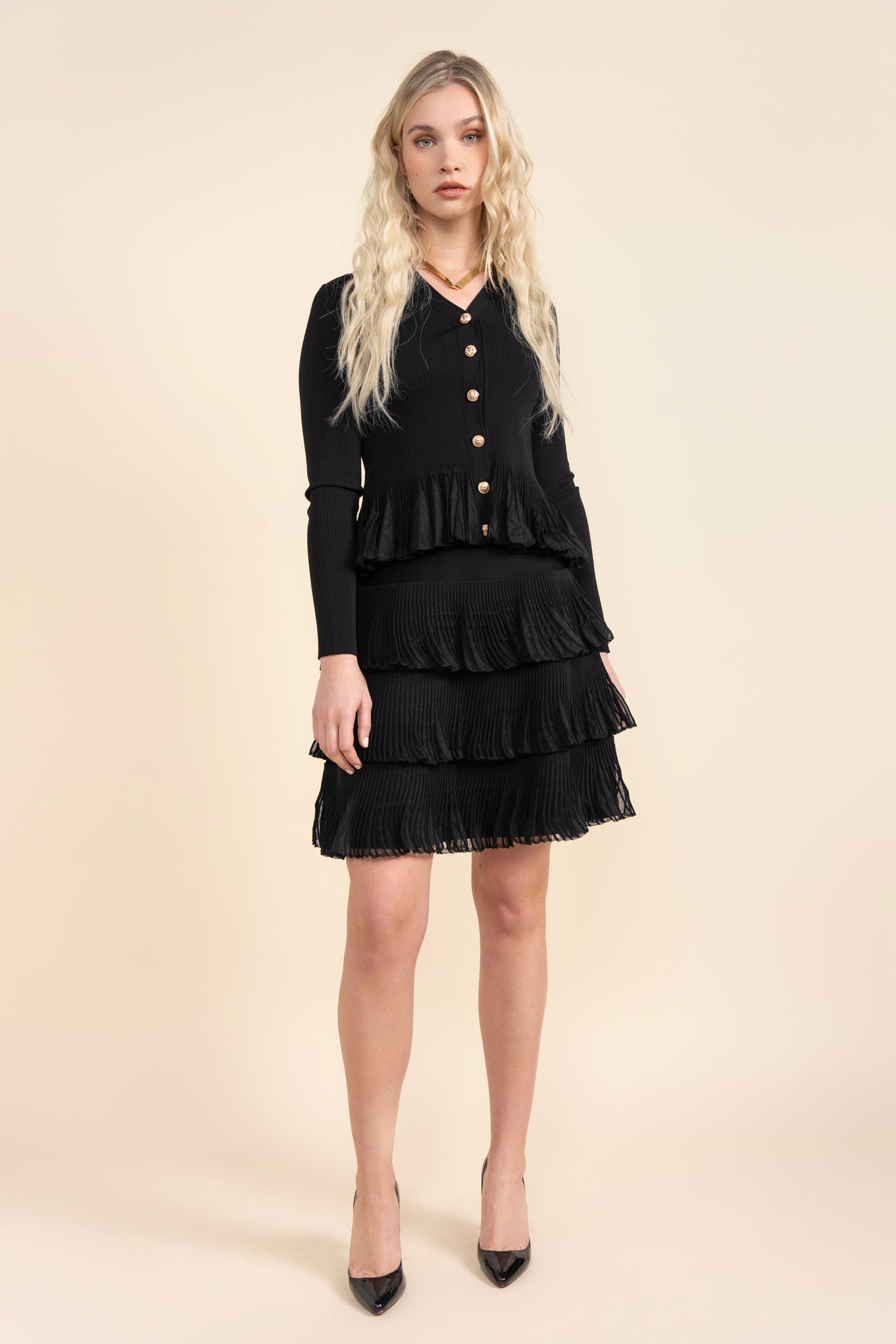 Elegant and sophisticated, our Venetian Cardigan offers a high quality ribbed knit for a touch of luxury. The sheer ruffle detail on bottom adds a graceful, feminine flair while the gold buttons add a subtle touch of elegance.