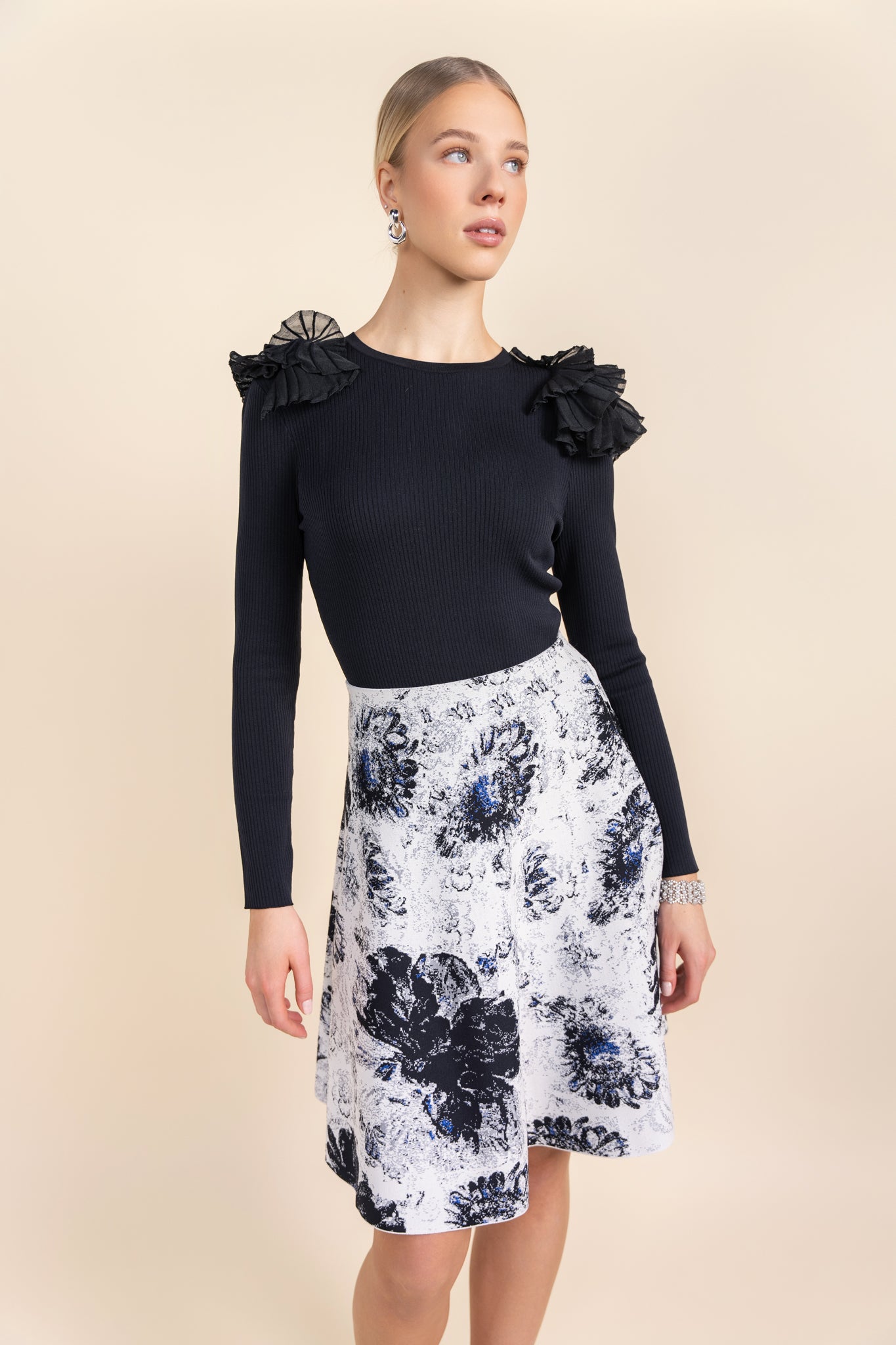 The Alton Skirt offers a sophisticated fit and flair silhouette, showcasing a delicate knit pattern and elegant floral motif. Elevate your wardrobe with this versatile and stylish piece.