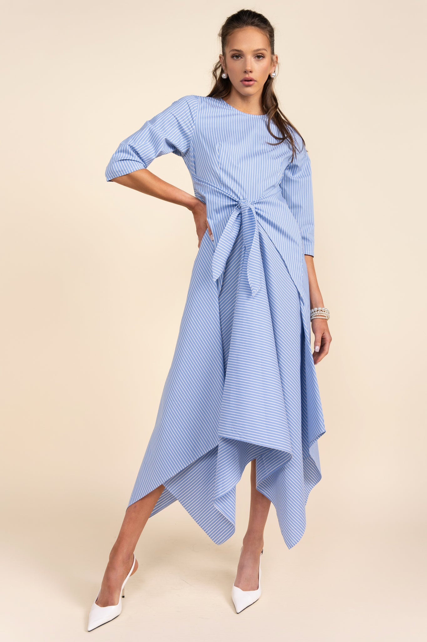 The Delancey Dress is both chic and comfortable. Crafted from high-quality cotton, this dress boasts a flattering 3/4 sleeve and a unique wrap tie at the waist. The a-symmetrical bottom adds a touch of sophistication to this versatile piece. Elevate your wardrobe with this must-have dress.