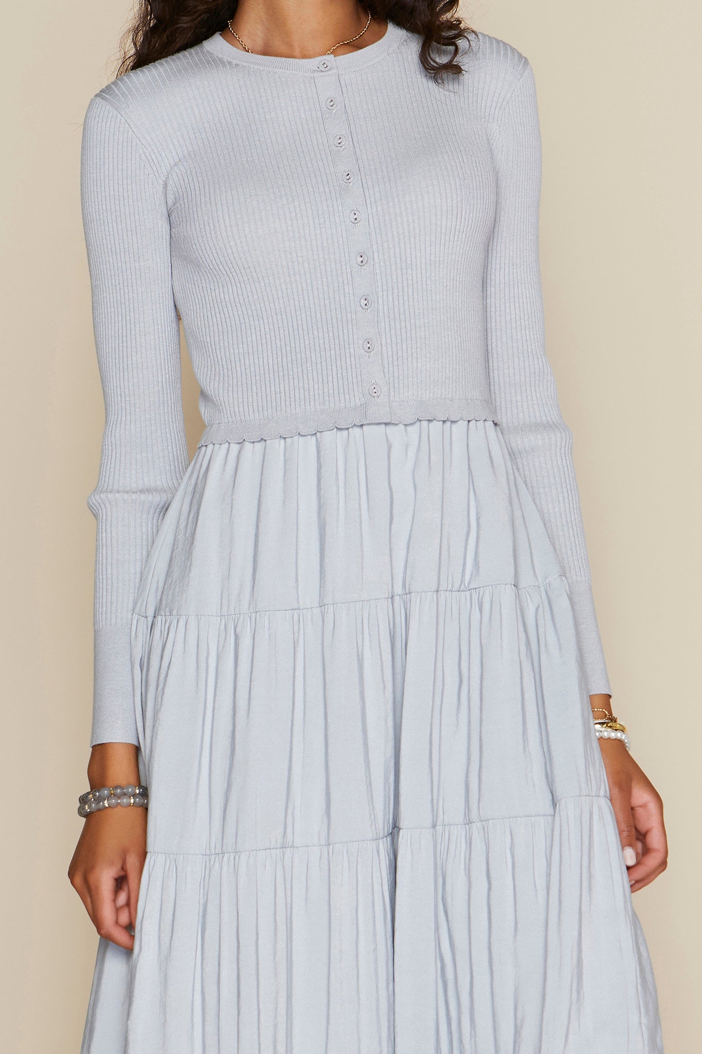 The Marmi Dress blends comfort with understated polish. Its soft ribbed cardigan top offers gentle structure without constraint, while the tiered lightweight bottom moves with ease and grace. Designed for those who refuse to compromise between style and wearability, this dress transitions effortlessly through your day—from casual moments to more refined occasions. Sophisticated simplicity at its finest.
