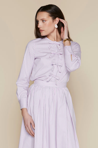 The Moorea Blouse embodies timeless elegance with its premium cotton construction and refined silhouette. A crew neckline frames the face beautifully, while concealed front buttons create a streamlined aesthetic. The signature bow detail running down the center adds a touch of feminine sophistication. Pair it with the coordinating Moorea Skirt to complete a cohesive, polished ensemble that exudes understated luxury and effortless style.