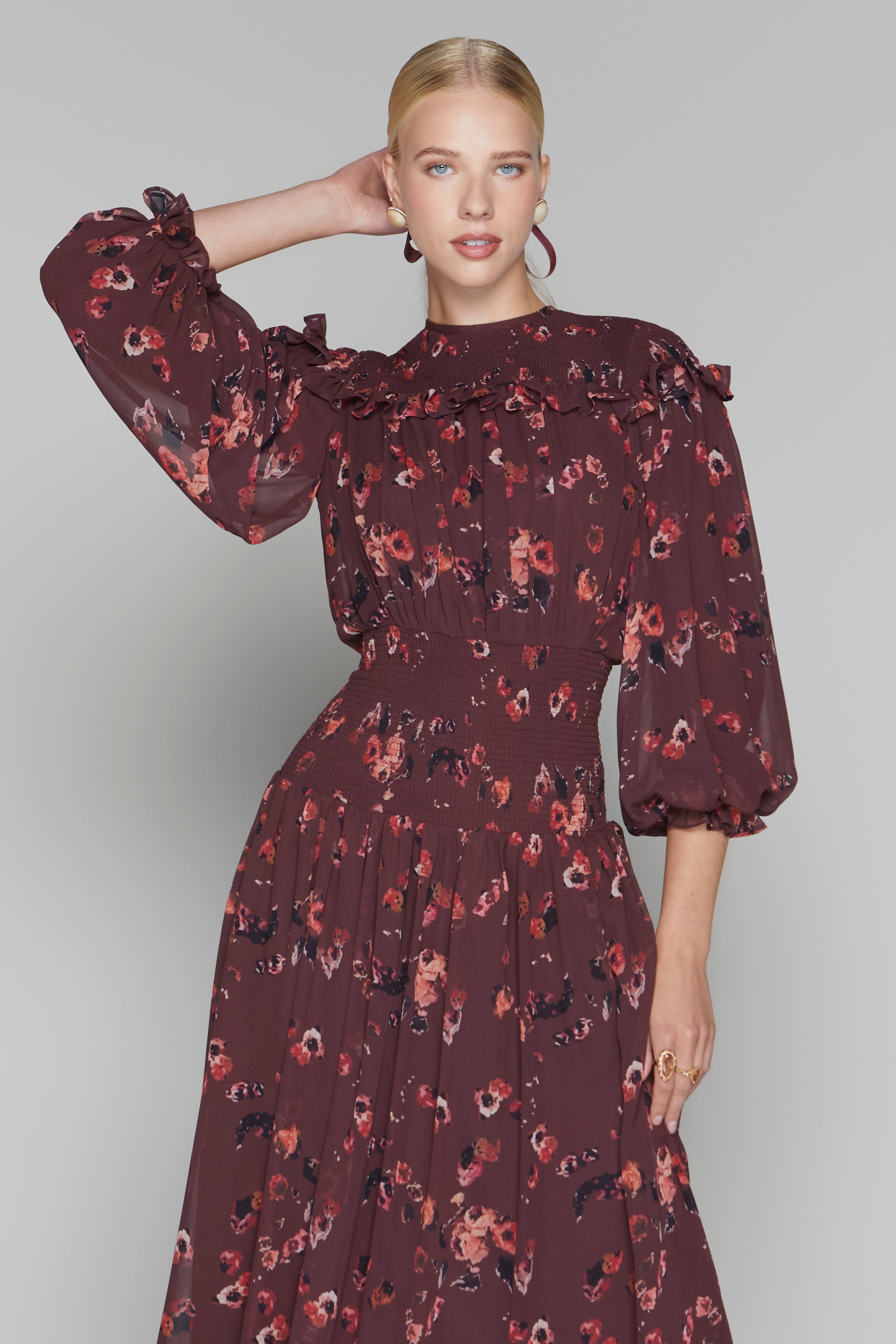 The Tilden Dress showcases a sophisticated silhouette with a smocked waist, crafted from luxurious chiffon fabric. Its maxi length flows gracefully, while elegant ruffles accent the cuffs and drop shoulders, creating a refined and timeless look perfect for any upscale event.